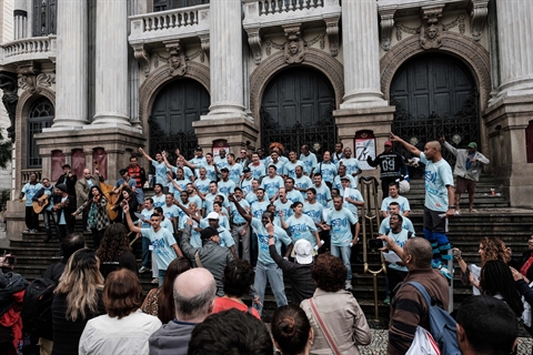 | Des sans-abris en concert sur les escaliers extérieurs de l'imposant Teatro Municipal, le 22 juillet 2016 à Rio. |
