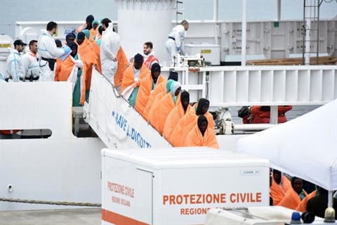 | Des migrants secourus en mer débarqués sur un port italien le 8 janvier. |