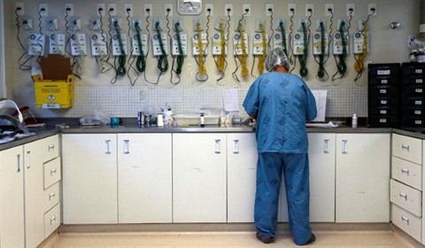| Un membre des équipes de soignants vérifie les respirateurs de l'unité de soins intensifs à l'hôpital Emilio Ribas à Sao Paulo, le 20 avril. |