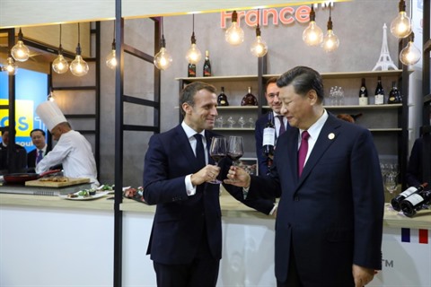 | Le président français Emmanuel Macron et son homologue chinois Xi Jinping visitent le pavillon français à la Foire internationale des importations à Shanghai, le 5 novembre. |