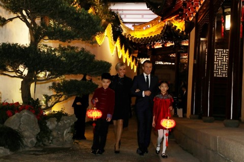 | Emmanuel Macron et son épouse Brigitte Macron arrivent au dîner ans le jardin Yu, au cœur du vieux Shanghai, le 5 novembre. |