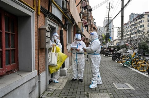 | Des personnels médicaux en combinaison intégrale de protection contre le COVID-19 dans une rue de Shanghai, le 26 mars. |