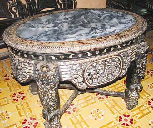 | La table ronde à surface de pierre, un des biens de Công tu Bac Liêu préservés dans la pagode. |