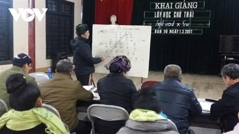 | Quàng Van Hac (debout) enseigne aux villageois l’écriture ancienne des Thaï |