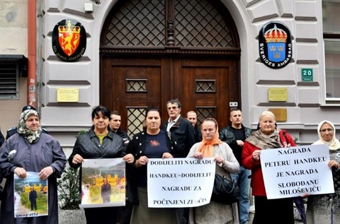 | Des membres d'associations de survivants bosniaques de la guerre de 1992-1995 manifestent le 5 novembre 2019 à Sarajevo contre la remise du prix Nobel de littérature à Peter Handke. |