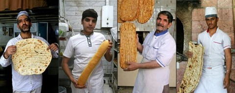 | Photo-montage, créé le 24 juin, de quatre boulangers iraniens posant avec quatre types de pains différents, dans leurs boulangeries respectives, à Téhéran. |