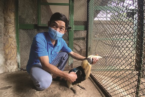 | Le calao bicorne, abrité avec une aile cassée, sauvé et soigné par des employés du jardin botanique et zoologique de Hô Chi Minh-Ville. |