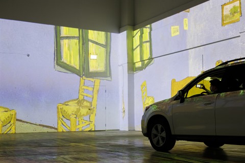 | Des spectateurs photographient depuis leur voiture des oeuvres de Vincent Van Gogh à l'ouverture de l'exposition "immersive" en drive-in. |