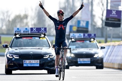 | Le Néerlandais Dylan van Baarle, vainqueur en solitaire de la semi-classique "À travers la Flandre", le 31 mars à Waregem. |