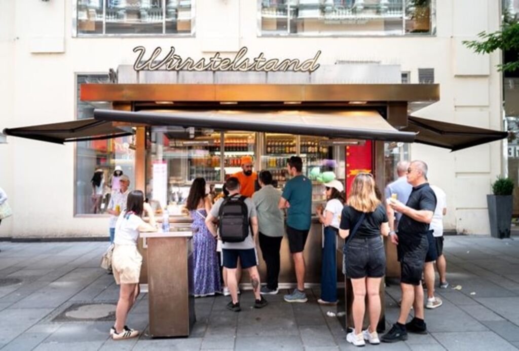 | Des clients font la queue devant le stand de saucisses "Wuerstelstand" près de la célèbre rue Kaertner à Vienne, en Autriche, le 18 juin. |