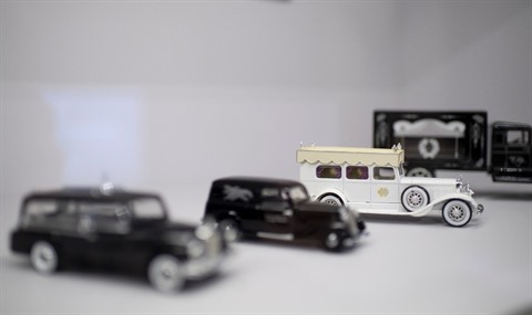 | Des corbillards miniatures sont exposés au musée des pompes funèbres à Vienne, le 20 octobre 2020. |