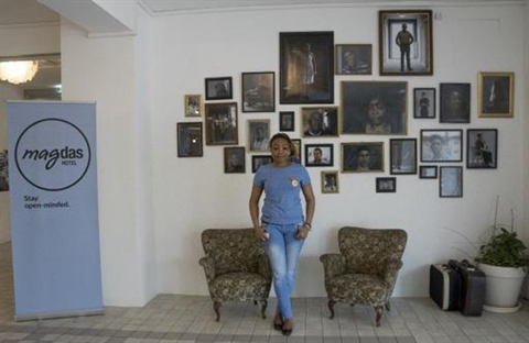 | Sarah, une des migrantes salariées de l'Hôtel Magdas à Vienne, dans le hall de l'établissement, le 16 avril 2015. |