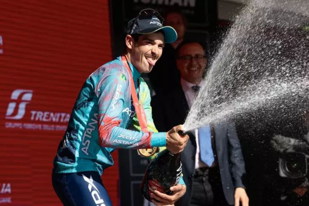 | Le coureur d'Astana Christian Scaroni arrose sa victoire d'étape sur le Giro, le 27 mai à San Valentino. |