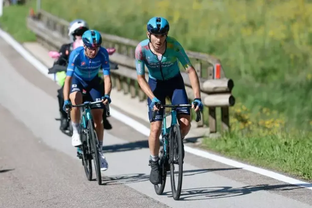 | Les coureurs italiens de l'équipe Astana Christian Scaroni (à dr.) et Lorenzo Fortunato dans l'ascension vers la victoire du premier à San Valentino, le 27 mai. |