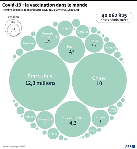 À ce jour, selon un décompte de l'AFP, au moins 60 pays ou territoires, qui regroupent 61% de la population mondiale, ont lancé leur campagne de vaccination. Mais 11 pays concentrent 90% des doses injectées.