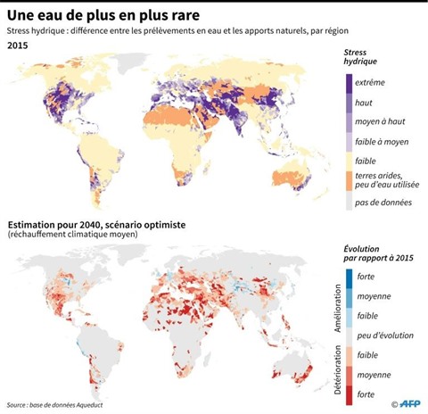 | Stress hydrique en 2015, évolution estimée en 2040. |