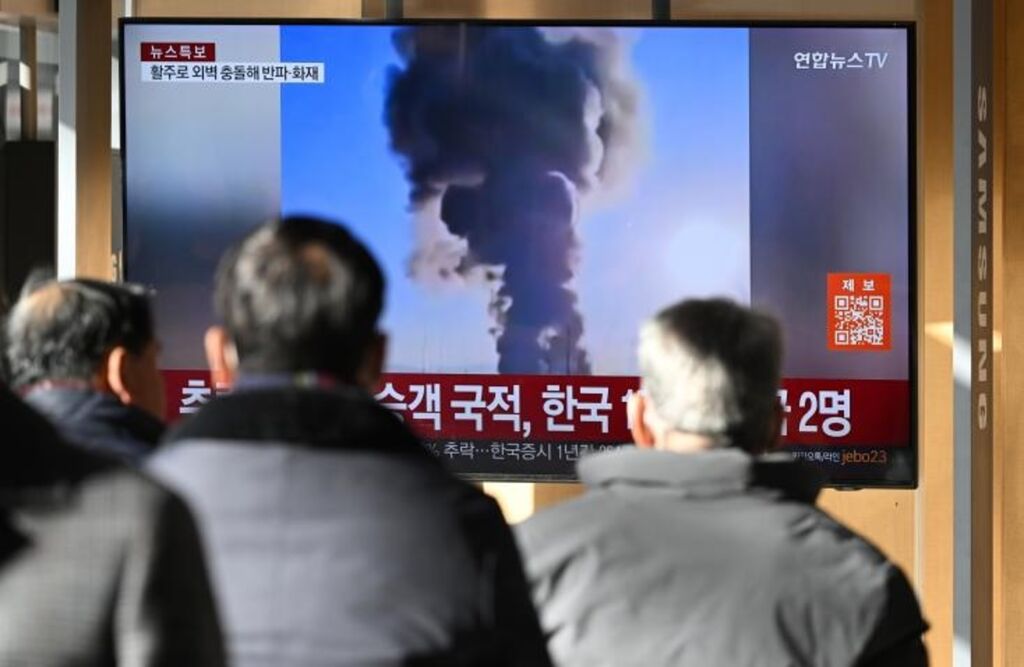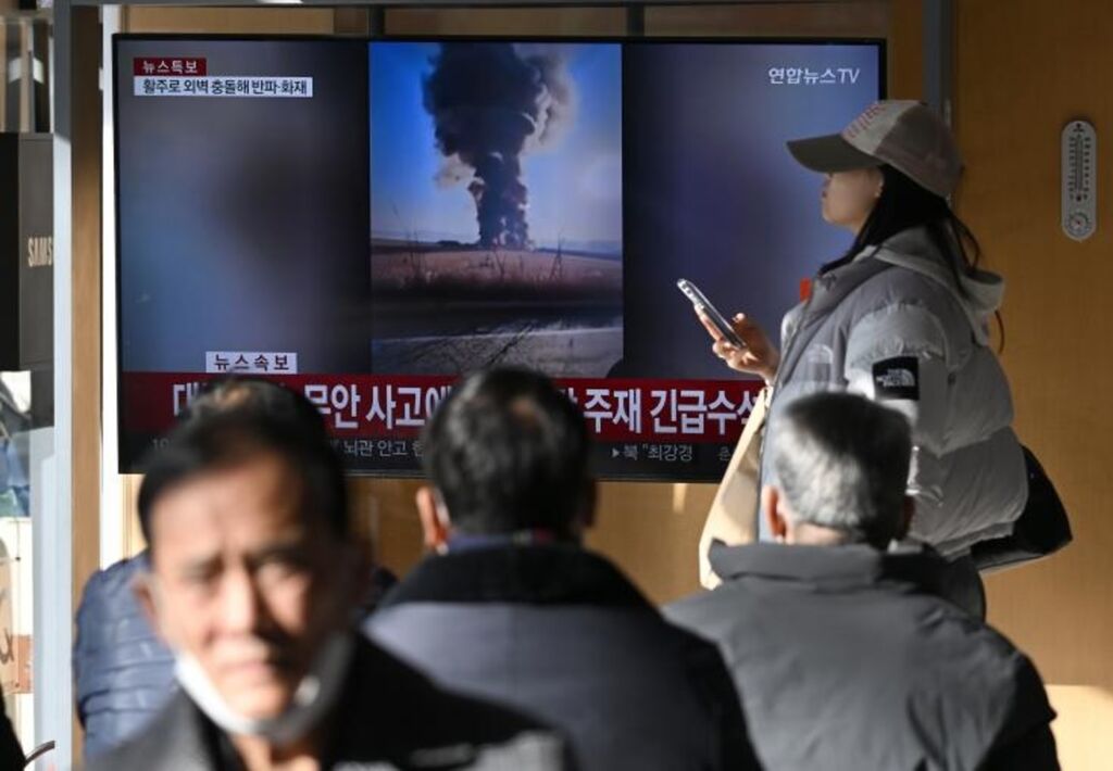 | Des passants regardent des images du crash sur un écran de télévision dans une gare de Séoul, le 29 décembre. |