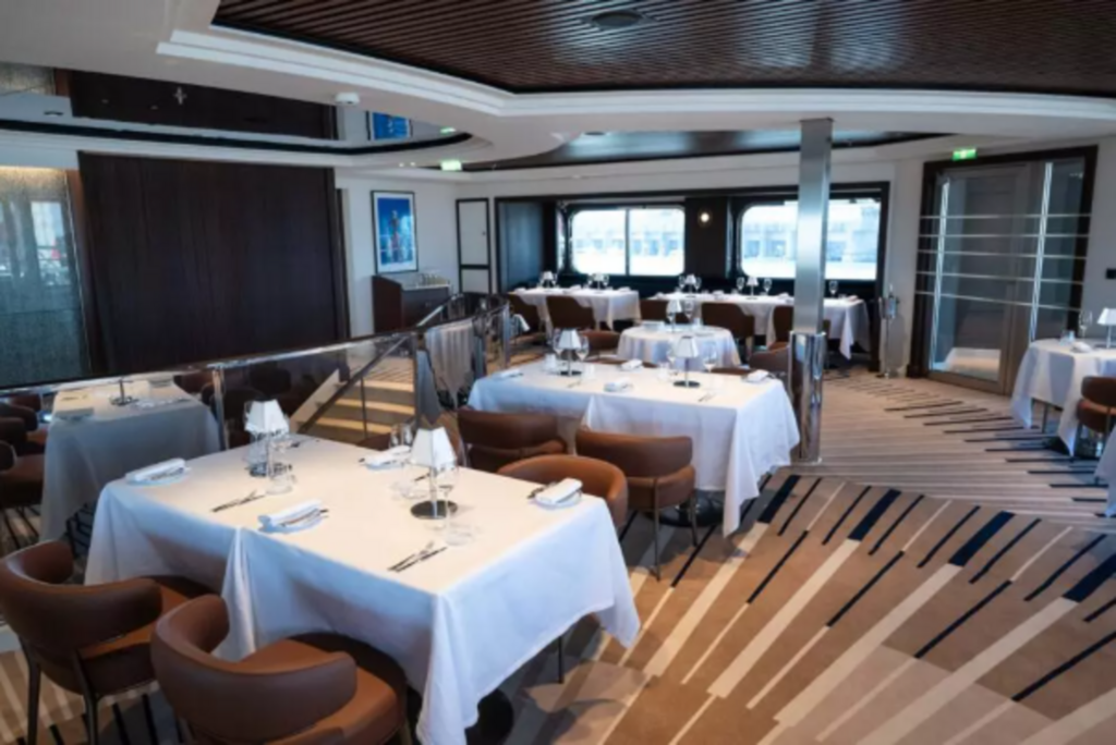| Le restaurant à bord du voilier Orient Express Corinthian, aux Chantiers de l'Atlantique à Saint-Nazaire, le 28 avril en Loire-Atlantique. |