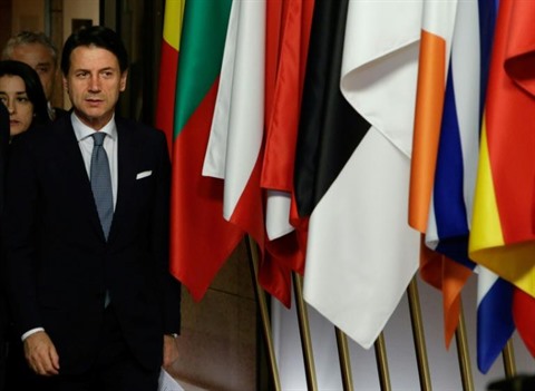 | Le Premier ministre italien Giuseppe Conte s'apprête à parler à la presse après l'accord trouvé entre Européens, le 29 juin à Bruxelles sur les migrations |