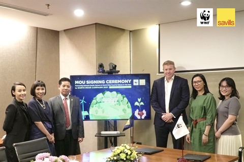 | Les dirigeants de Savills Vietnam et de WWF lors de la cérémonie de signature d'un protocole d'accord pour l’"Heure de la Terre 2021", le 24 mars à Hô Chi Minh-Ville. |