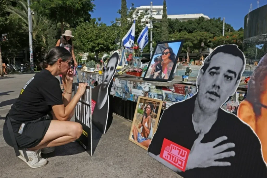 | Rassemblement à Tel-Aviv devant un mémorial pour les Israéliens tués durant et depuis l'attaque du Hamas, le 7 octobre. |