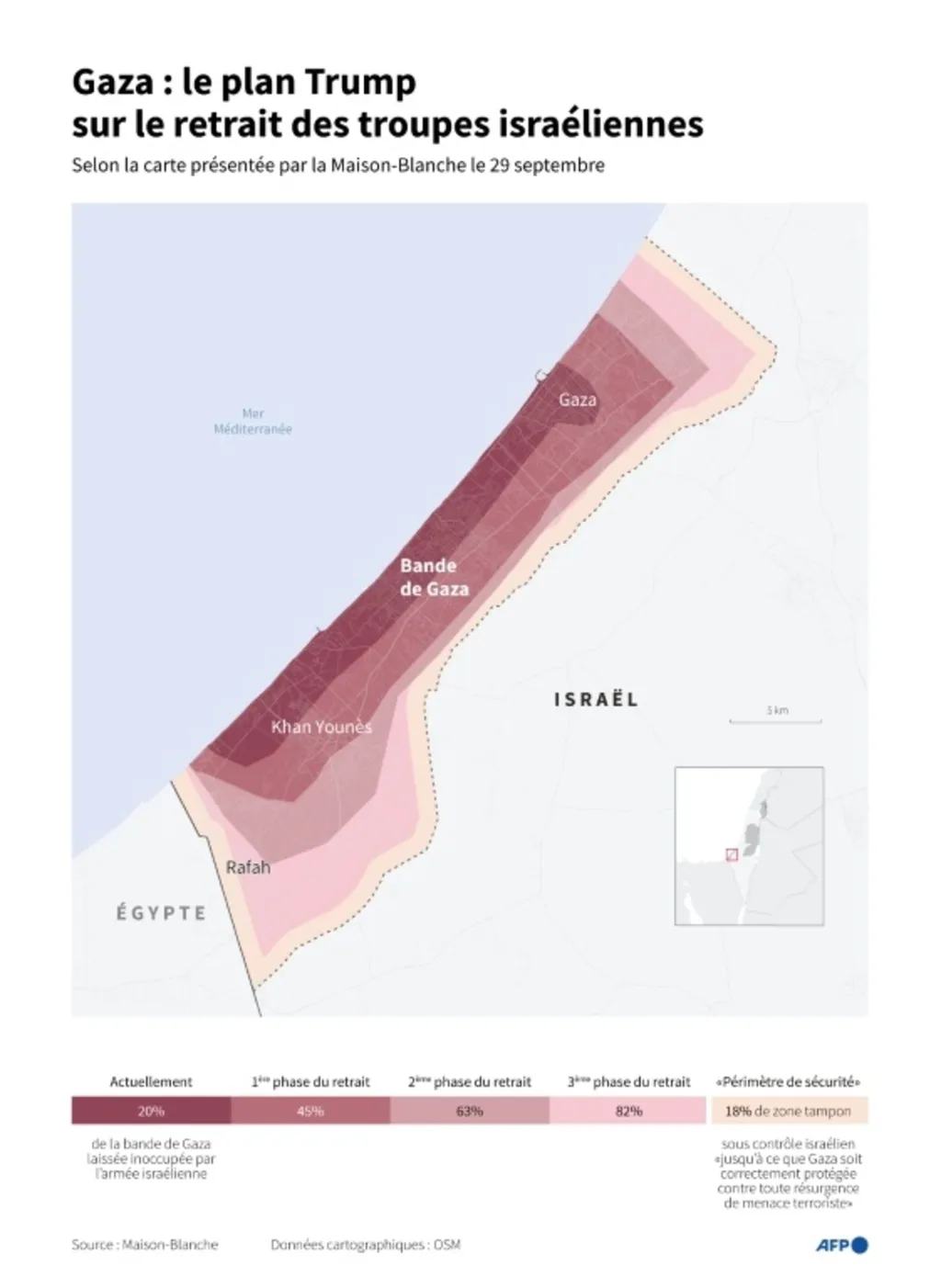 Le plan Trump annoncé le 29 septembre prévoit un cessez-le-feu, un échange des otages enlevés le 7 octobre 2023 contre des prisonniers palestiniens retenus par Israël, le retrait par étapes de l'armée israélienne de Gaza et le désarmement du Hamas.