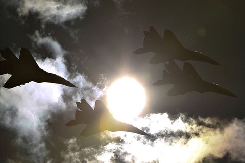 | Des MiG-29 et des Sukhoi Su-27 russes. |