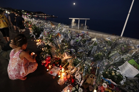 | Fleurs et bougies en hommage aux victimes de l'attentat de Nice. |