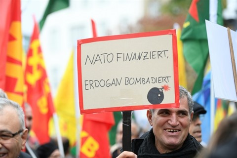 | Un protestataire brandit une pancarte "L'Otan finance, Erdogan bombarde", durant une manifestation pro-kurde à Cologne, dans l'Ouest de l'Allemagne, le 19 octobre. |