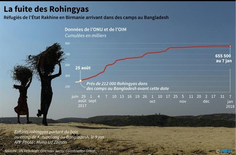 | Évolution du nombre de Rohingyas fuyant au Myanmar pour se réfugier dans des camps au Bangladesh, le 7 janvier. |