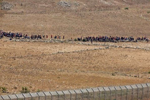 | Des Syriens déplacés par les combats dans le Sud de leur pays près de la ligne démarcation sur le Golan. |