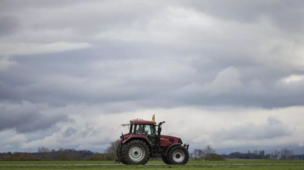 | Un agriculteur opposé à l'accord UE - Mercosur conduit son tracteur à Arras, dans le Nord de la France, le 19 novembre. |