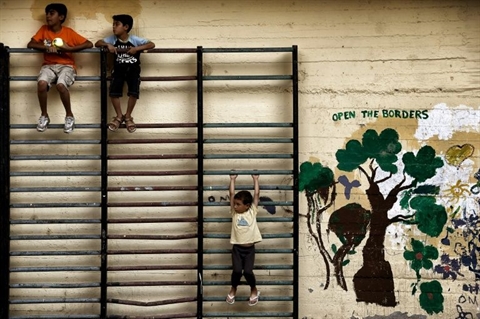 | Des enfants jouent dans une cour d'école abandonnée où sont accueillis des réfugiés afghans et syriens, le 1er juillet à Athènes . |