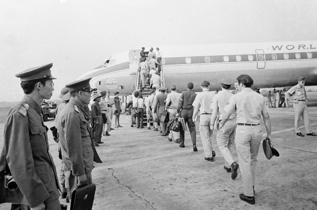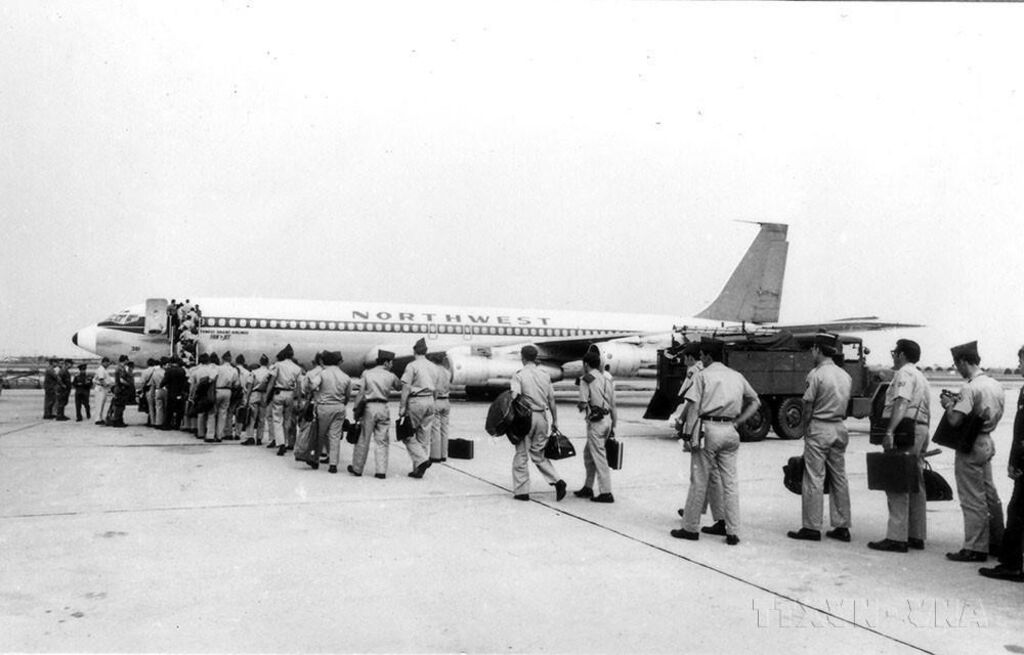 | Des soldats américains montent à bord d’un avion pour se retirer du Sud-Vietnam sous la supervision de l’Armée de la République démocratique du Vietnam et de l’Armée de libération, à l’aéroport de Tân Son Nhât, le 19 mars 1973. |