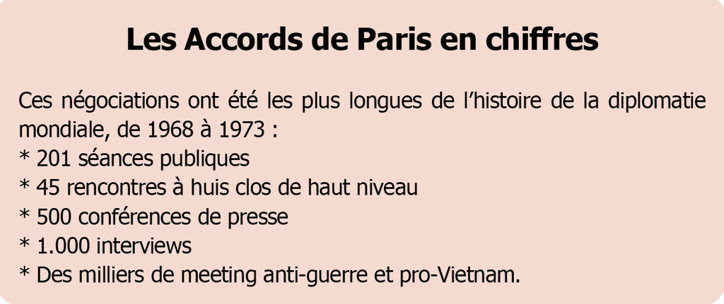 Le 27 janvier 1973 à Paris, sont signés les accords qui aboutiront, deux ans plus tard, à la fin de la guerre du Vietnam. Cet “accord sur le cessez-le-feu et le rétablissement de la paix au Vietnam” est le fruit de cinq années d’âpres négociations qui évoluaient en même temps que la situation sur les fronts. Une joute d’esprit, un combat stratégique et tactique.