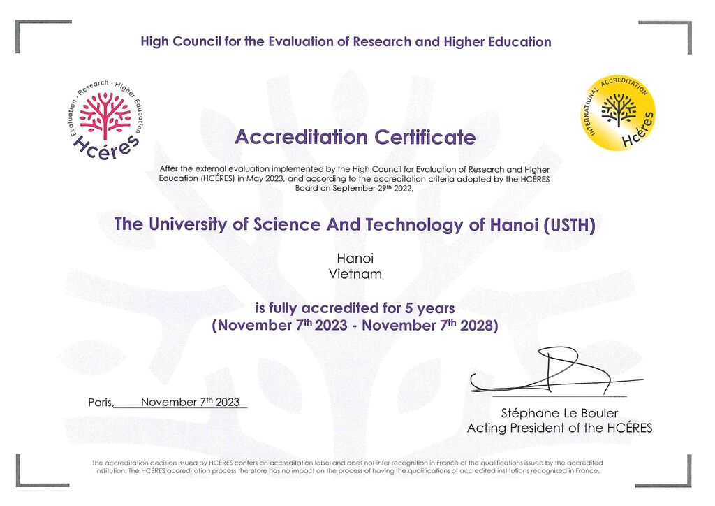 L’accréditation du Hcéres, qui repose sur le respect des normes européennes (European Standards and Guidelines - ESG), est un label internationalement reconnu, notamment en ce qui concerne la validité des diplômes délivrés par les universités. “Avec la décision du Hcéres, l’USTH rejoint officiellement le groupe des universités vietnamiennes accréditées selon les standards internationaux. Cette réalisation est le fruit des efforts et des contributions des parties vietnamienne et française, du Consortium des universités et instituts de recherche français pour le développement de l’USTH (USTH Consortium), de l’Académie des sciences et technologies du Vietnam (VAST), des ministères et gouvernements qui nous ont fait confiance au fil des années”, déclare avec fierté le Pr. Jean-Marc Lavest, recteur principal de l’université.