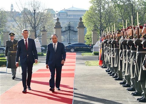 | Le Premier ministre Nguyên Xuân Phuc (gauche) et son homologue tchèque Andrej Babis, passent en revue la garde d'honneur, le 17 avril à Prague. |