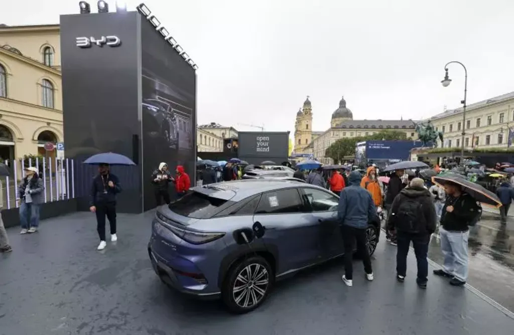 | Un véhicule BYD devant le stand du constructeur chinois à Munich, en Allemagne, le 10 septembre. |