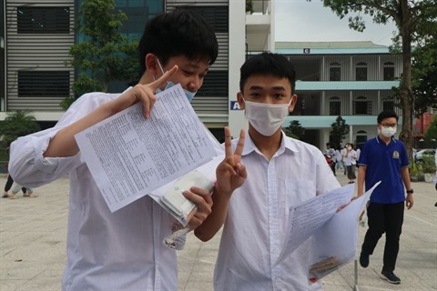 | Deux lycéens après avoir terminé l'examen du baccalauréat 2022, le 8 juillet à Hai Duong (Nord). |