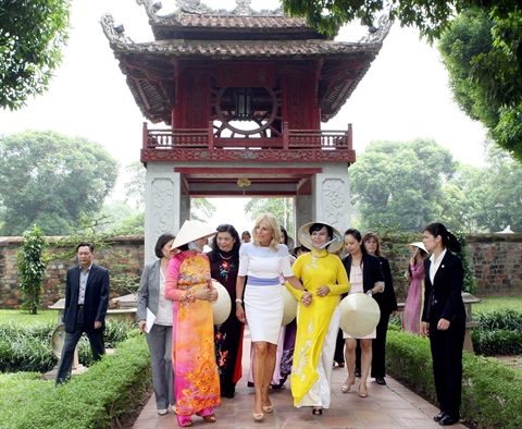 | L'épouse du vice-président américain Joe Biden, Jill Biden (robe blanche), visite le Temple de la Littérature, le 20 juillet à Hanoi. |