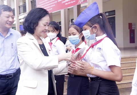 Au lycée Xithanaxay - cadeau de Nguyen Phu Trong, secrétaire général du Parti communiste du Vietnam (PCV), Truong Thi Mai a remis 200 cadeaux aux élèves en difficulté de l’école. A cette occasion, la province de Hà Tinh a offert à Bolykhamxay 10 ordinateurs.