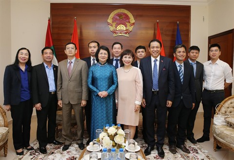 | La vice-présidente Dang Thi Ngoc Thinh (4e à gauche) et les personels de l'ambassade du Vietnam aux Émirats arabes unis (EAU). |