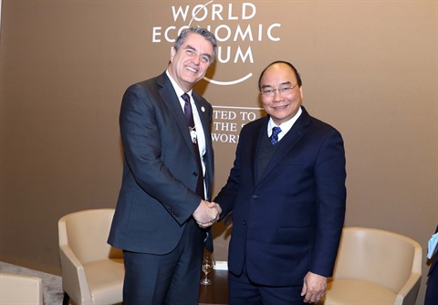 | Le Premier ministre Nguyên Xuân Phuc (droite) lors de la rencontre avec le directeur général de l'OMC, Roberto Azevedo, à Davos. |