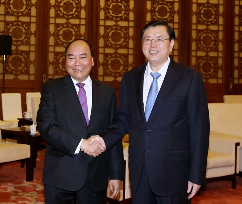 | Le Premier ministre Nguyên Xuân Phuc (gauche) et Zhang Dejiang, président du Comité permanent de l'Assemblée nationale populaire de Chine, le 12 septembre à Pékin, Chine. |
