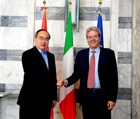 | Le président du Comité centrale du FPV, Nguyên Thiên Nhân (gauche) et le ministre italien des Affaires étrangères Paulo Gentiloni, le 1er juillet à Rome. |