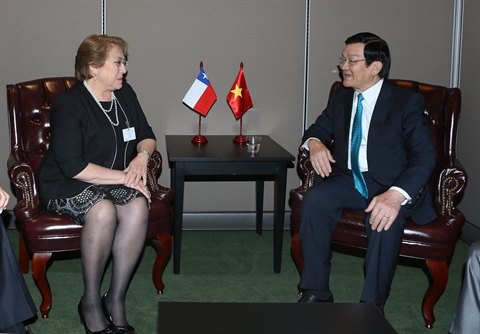 | Le président Truong Tân Sang et son homologue chilien, Mme Michelle Bachelet, le 27 septembre à New York. |
