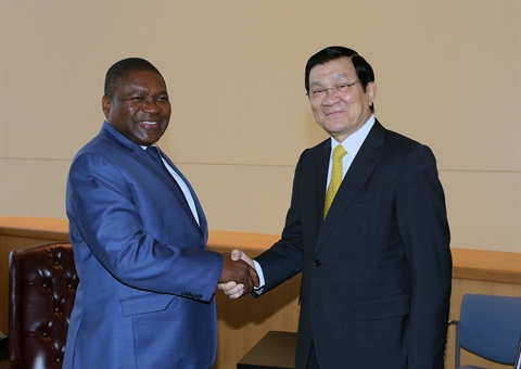 | Le président vietnamien Truong Tân Sang (droite) et son homologue mozambicain, Filipe Nyusi. |