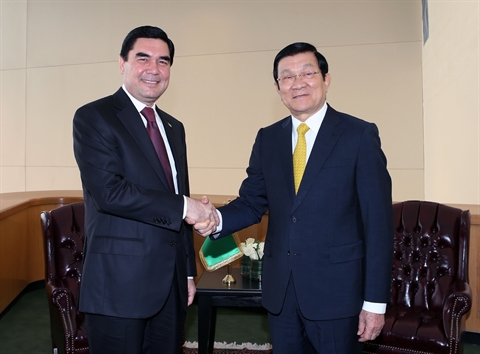 | Le président vietnamien Truong Tân Sang (droite) et son homologue turkmène Gurbanguly Berdimuhamedow. |