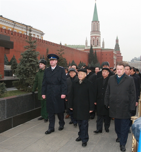 | Le secrétaire général du Parti communiste du Vietnam, Nguyên Phu Trong (centre), le 24 novembre à la place Rouge. |