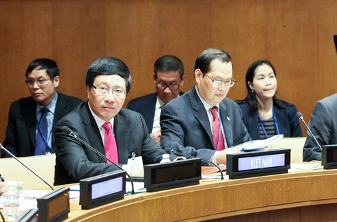 | Le vice-Premier ministre et ministre des Affaires étrangères (AE), Pham Binh Minh, lors d'une réunion entre les ministres des AE de l'ASEAN et le scrétaire général et président de l'Assemblée générale de l'ONU, le 26 septembre à New York. |